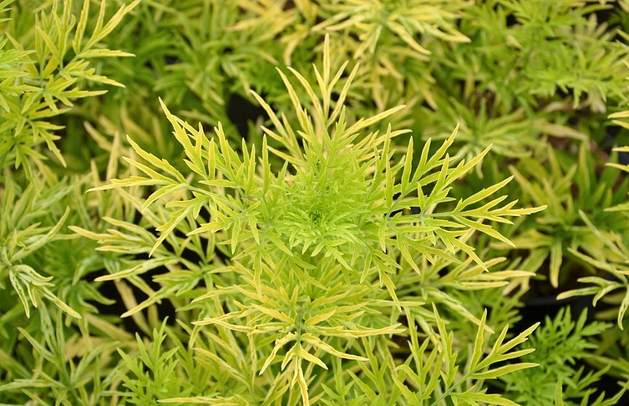Уникальность сорта в зеленовато-лимоновых листьях рассеченного типа. Цветет кустарник в мае-июне желтыми некрупными цветками, собранными в соцветия щитковидного типа. Плоды черные, шаровидные, съедобные.
