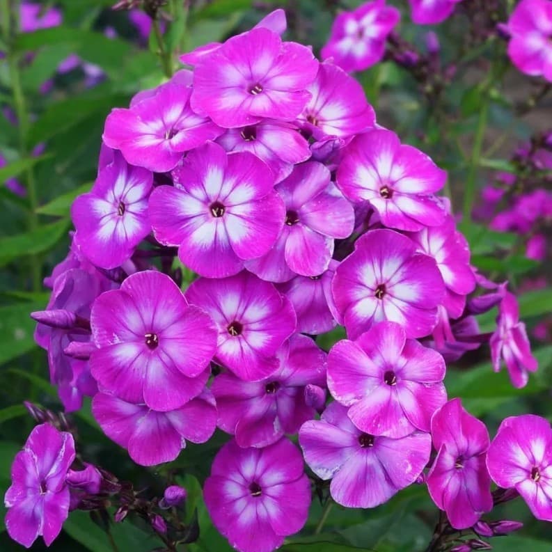 • крупные в диаметре цветки. Цвет у лепестков насыщенный пурпурно-фиолетовый. Центр каждого цветочка украшает большая белая звезда. Семена могут не сохранять особенности гибридных сортов, поэтому размножать лучше черенкованием или делением куста. Уход за флоксом метельчатым Лаура под силу даже начинающему цветоводу.