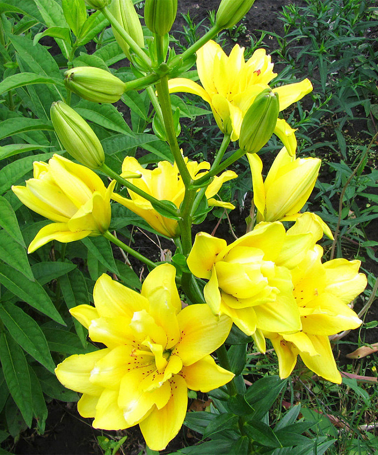 Окраска цветка : Цветки чашевидные, махровые (12 лепестков), ярко-желтые, ближе к центру единичный мелкий крап
