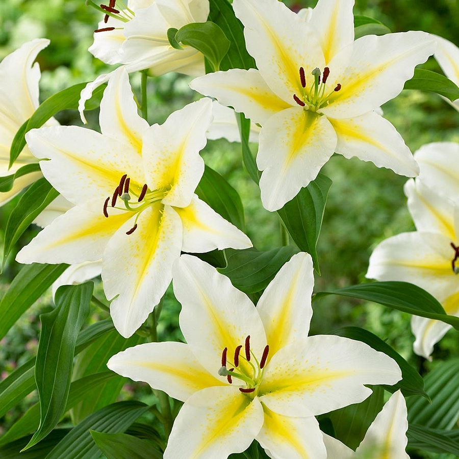 Саженцы и рассада многолетней Лилии восточной Венесуэла (Lilium Oriental Hybrid Venezuela) вырастают до 110 см в высоту. Максимально комфортно чувствуют себя на плодородных слабокислых торфяных почвах с хорошим дренажем, на солнечных или полутеневых местах. Не любят застоя воды и воздуха. Цветки с приятным сильным запахом, белоснежные, с широкой ярко-желтой полосой вдоль центрального сгиба лепестка, ближе к тычинкам полоса расширяется. Лепестки волнистые, слегка загнутые от центра. Начинает цвести в конце июня, июле. На зиму требует укрытия при отсутствии снега, мульчирования почвы перед зимовкой.