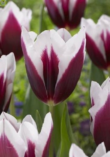 Тюльпан Триумф Шпицберген - это великолепное растение с бордовыми цветками, украшенными широким белым краем. Его стебель достигает высоты до 45 см, что делает его идеальным выбором для групповых и одиночных посадок. Листья тюльпана имеют травянистую форму, что придает растению особый шарм.